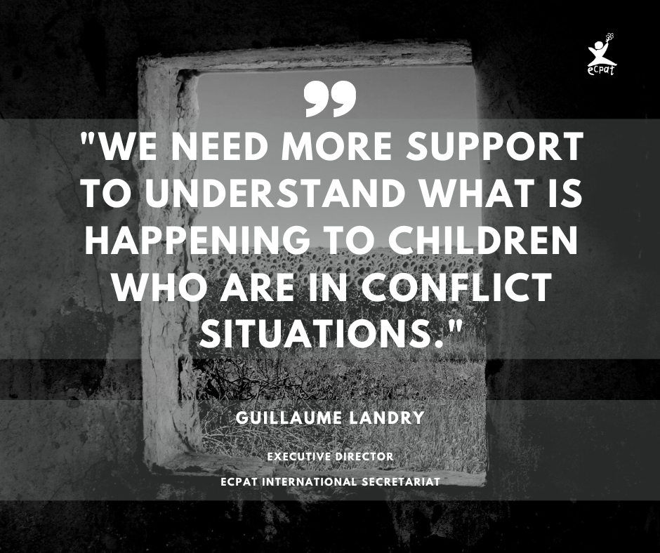 “We need more support and action to understand what is happening to children who are in conflict situations. Governments need to prioritise children’s rights and ensure that children are safe while being on the move”, calls Guillaume Landry, ECPAT Executive Director.