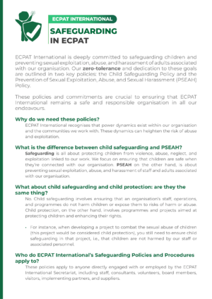 All ECPAT International staff are trained on child safeguarding and actively integrate it into their activities, projects and partnerships, for instance through conducting risk assessment, child-safe recruitment, and promoting child safeguarding in our work with partners.