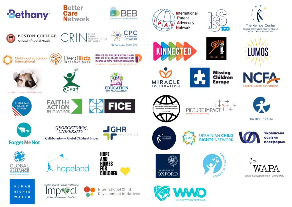 As of 8 March 2023, this joint statement has been endorsed by the following 43 organisations, agencies, and networks: Bethany Christian Services, Better Care Network, Boston College School of Social Work, Both Ends Believing, CPC Learning Network at Columbia University, Childhood Education International, Child Rights International Network, Deaf Kidz International, Defence For Children International, Disability Rights International, ECPAT International, Education For All Coalition, European Disability Forum, Faith to Action Initiative, FICE International, Forget Me Not, Georgetown University Collaborative on Global Children’s Issues, GHR Foundation, Global Social Service Workforce Alliance, Hope and Homes for Children, Hopeland, Human Rights Watch, IMPACT: Center Against Human Trafficking and Sexual Violence in Conflict, International Child Development Initiatives (ICDI), International Parent Advocacy Network, International Social Services (ISS), Kempe Center on the Prevention and Treatment of Child Abuse and Neglect, Kinnected, La Strada International, Lumos, Miracle Foundation, Missing Children Europe, National Council For Adoption, Partnership for Early Childhood Development & Disability Rights (PECDDR), Picture Impact, RISE Institute, The Kempe Foundation, Ukrainian Child Rights Network, Ukrainian Education Platform, University of Oxford Dept of Social Policy and Intervention, Voices of Children, WAPA International, and World Without Orphans