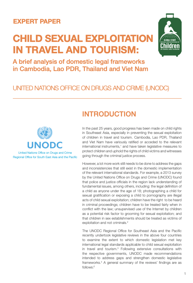 The UNODC Regional Office for Southeast Asia and the Pacific recently undertook legislative reviews in the above four countries to examine the extent to which domestic legislation met key international legal standards applicable to child sexual exploitation in travel and tourism. Following extensive consultations with the respective governments, UNODC made recommendations intended to address gaps and strengthen domestic legislative frameworks.