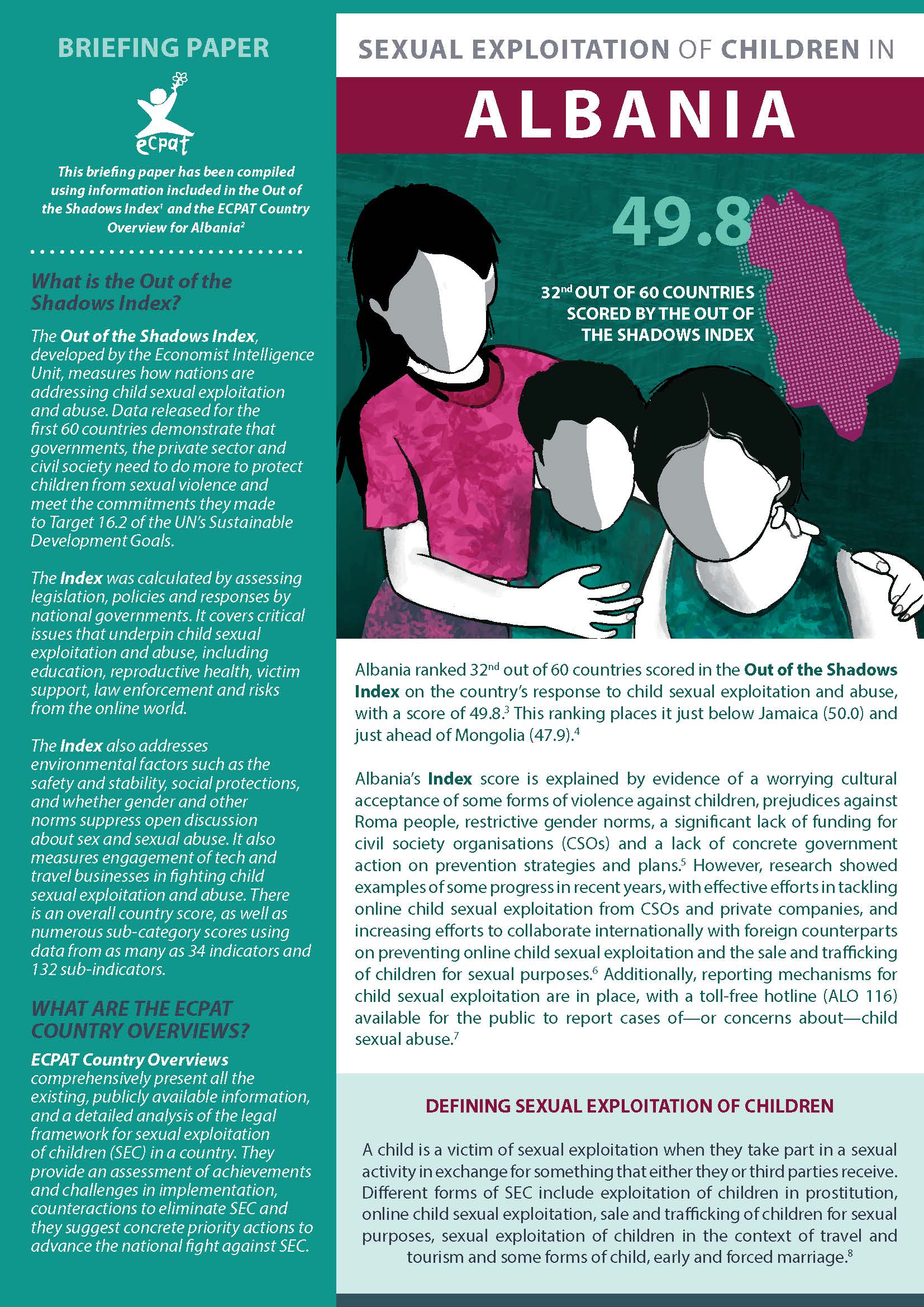 The sexual exploitation of children in Albania – this is what we know about the issue. Albania ranked 32nd out of 60 countries scored in the Out of the Shadows. The ranking is explained by evidence of a worrying cultural acceptance of some forms of violence against children, prejudices against Roma people, restrictive gender norms, a significant lack of funding for civil society organisations (CSOs) and a lack of concrete government action on prevention strategies and plans.