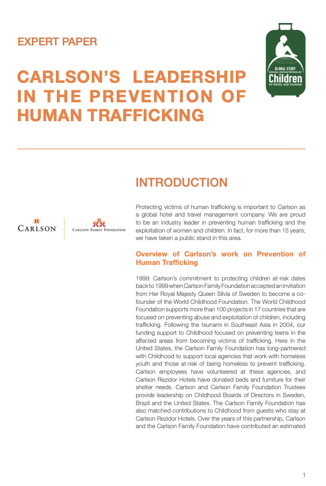 The hospitality industry has a critical role to play in protecting the most vulnerable minors and women from trafficking as well as putting strong safeguards in place to prevent these crimes from happening in hotels. Carlson has made significant contributions over the last 15 years to education, advocacy, partnership with law enforcement and support for victims’ services, with the aim of protecting victims of trafficking.