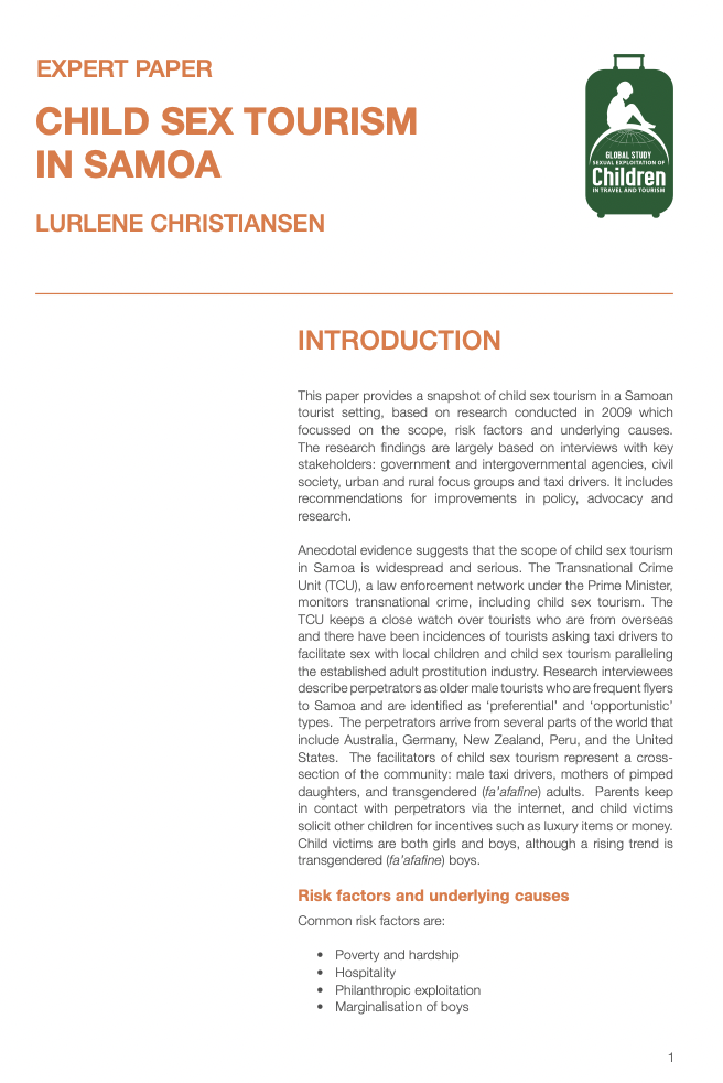 This paper provides a snapshot of child sex tourism in a Samoan tourist setting, based on research conducted in 2009 that focused on the scope, risk factors and underlying causes. The research findings are largely based on interviews with key stakeholders: government and intergovernmental agencies, civil society, urban and rural focus groups and taxi drivers. It includes recommendations for improvements in policy, advocacy and research.