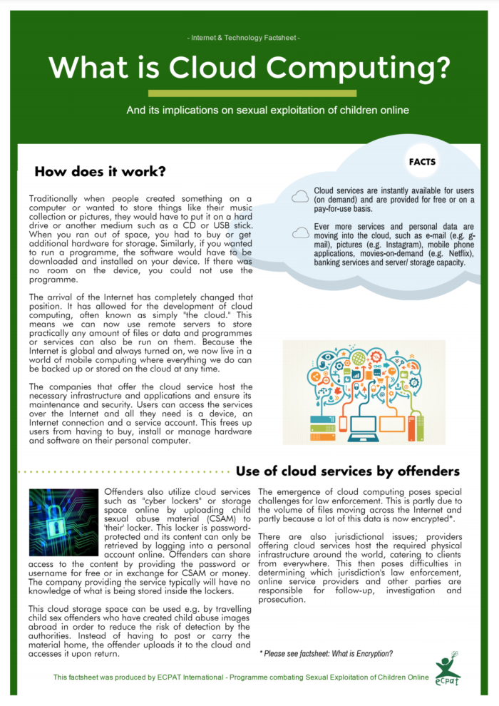 Part of a series on technologies linked to the sexual exploitation of children. Factsheet on how cloud computing is used by child sex offenders as ‘safe’ storage space online for child sexual abuse material (CSAM).