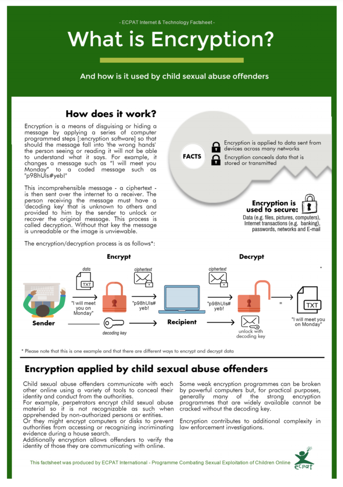 Part of a series on technologies linked to the sexual exploitation of children. Factsheet on encryption, a means of hiding online message content. It can be used by child sex offenders to communicate and share child sexual abuse materials (CSAM).