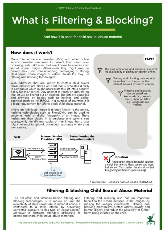 Part of a series on technologies linked to the sexual exploitation of children. Factsheet on filtering and blocking: technologies which allow internet service providers (ISPs) to prevent users from accessing websites that contain child sexual abuse material (CSAM).