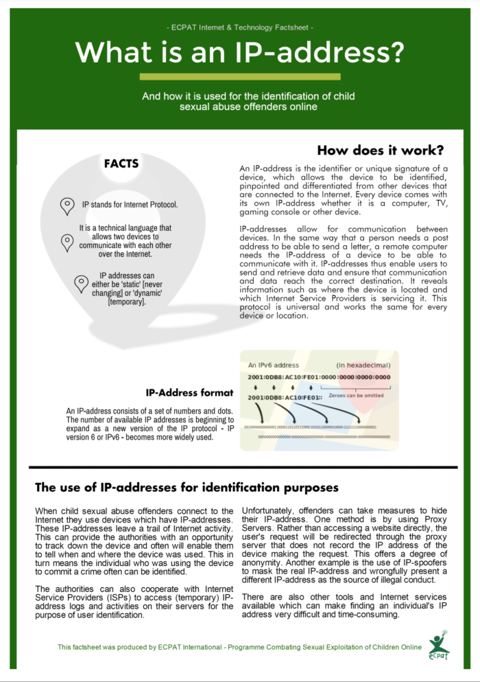 Part of a series on technologies linked to the sexual exploitation of children. Factsheet on how IP addresses can be used to identify child sex offenders who communicate about child sexual exploitation or share child sexual abuse material online (CSAM).