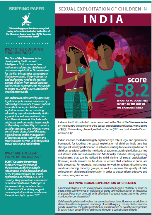 India ranked 15th out of 60 countries scored in the Out of the Shadows Index on the country’s response to child sexual exploitation and abuse. This ranking is largely explained by a robust legal and operational framework for tackling the sexual exploitation of children. India also has strong civil society participation in activities relating to sexual exploitation of children, as evidenced by the multitude of awareness raising initiatives carried out at both state and national levels. However, much remains to be done to ensure that children in India are fully protected.