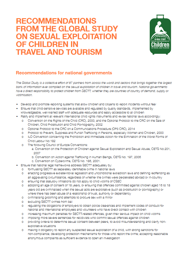 Recommendations for National Governments from the findings of The Global Study on Sexual Exploitation of Children in Travel and Tourism.