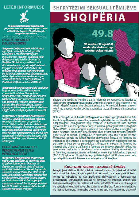Shqipëria u rendit në vendin e 32-të ndërmjet 60 vendeve, në kuadër të vlerësimit të Treguesit të Daljes në Dritë mbi përgjigjen dhe reagimin e një vendi ndaj shfrytëzimit dhe abuzimit seksual të fëmijëve, duke marrë notën 49.8. Nota e Shqipërisë në kuadër të Treguesit u ndikua nga një sërë faktorësh: tradita shqetësuese e pranimit nga ana e shoqërisë të disa formave të dhunës ndaj fëmijëve, paragjykimet ndaj fëmijëve të komunitetit rom, normat gjinore kufizuese, mungesën serioze të fondeve për organizatat e shoqërisë civile (OSHC), si dhe mungesa e planeve parandaluese dhe strategjive nga ana e qeverisë.