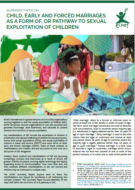 The ECPAT Summary Papers explore what we’ve learned over 30 years of working to protect children from sexual exploitation. The papers offer a stock take of what has changed in the way the crimes are committed, how our understanding has developed, and what we know today about the crimes and how to end them. This paper looks at child, early and forced marriages as a form of, or pathway to sexual exploitation of children.