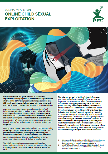 The ECPAT Summary Papers explore what we’ve learned over 30 years of working to protect children from sexual exploitation. The papers offer a stock take of what has changed in the way the crimes are committed, how our understanding has developed, and what we know today about the crimes and how to end them. This paper looks at Online Child Sexual Exploitation.