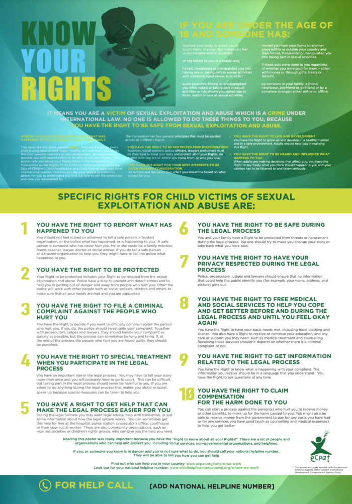 Child friendly poster which covers the rights that victims of sexual exploitation and abuse have, outlines how to recognize a victim, and gives information on how and where to seek help.