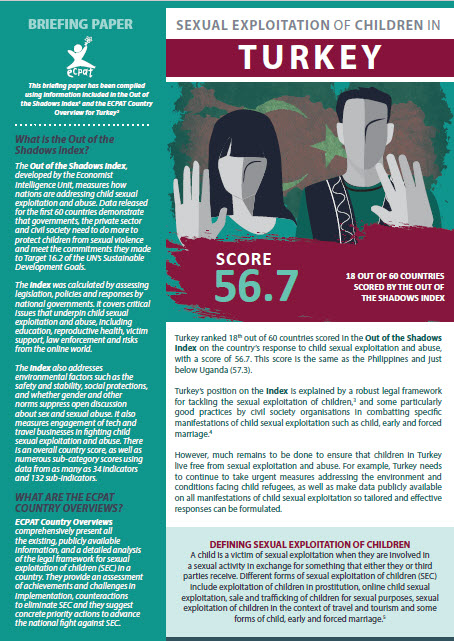 The sexual exploitation of children in Turkey – this is what we know about the issue. Turkey ranked 18th out of 60 countries scored in the Out of the Shadows. Turkey needs to continue to take urgent measures addressing the environment and conditions facing child refugees, as well as make data publicly available on all manifestations of child sexual exploitation so tailored and effective responses can be formulated.