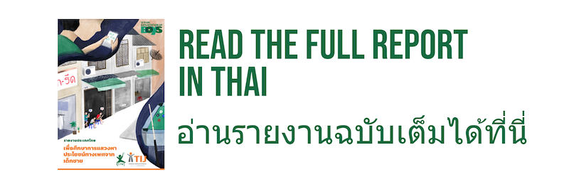 ดังนั้นในปีพศ. 2563 นี้ เอ็คแพท อินเตอร์เนชั่นแนลได้ทำการสำรวจ โดยการพูดคุยกับเยาวชนเป็นจำนวน 20 คน ที่เรียกตัวเองว่า “กลุ่มความหลากหลาย SOGIE” เพื่อเรียนรู้ว่าพวกเขามีความเป็นอยู่อย่างไรจากการที่ต้องมีเพศสัมพันธ์เพื่อการแลกเปลี่ยนกับเงินและสิ่งของ ในกลุ่มนี้มีเด็กจำนวน 11 คน ที่ระบุเพศของตนว่าเป็นชาย อีก 6 คน เรียกตนเองว่า ‘สาวประเภทสอง’ ส่วนอีก 2 คน บอกว่าตัวเองเป็นผู้หญิงข้ามเพศ และอีก 1 คน เป็น ‘เพศทางเลือก’ ในจำนวนผู้ให้สัมภาษณ์ทั้งหมดมีอายุระหว่าง 15-24 ปี และส่วนใหญ่ย้ายถิ่นฐานจากชนบทเข้าสู่ตัวเมือง ในจำนวนนี้ส่วนใหญ่มีการขายบริการทางเพศมามากกว่า 1 ปีแล้ว และอีกกว่าครึ่งนึง เริ่มมีเพศสัมพันธ์เพื่อแลกเปลี่ยนกับเงินและสิ่งของตอนที่ยังเป็นเด็ก ทีมงานของเอ็คแพทยังต้องทำความเข้าใจอีกมาก เกี่ยวกับทัศนคติของนักสวัสดิการสังคมที่ทำงานกับเด็กชาย หลังจากได้พูดคุยกับนักสวัสดิการสังคมส่วนหน้า 65 ราย ทั้งในเชียงใหม่ กรุงเทพฯ และพัทยา นี่คือข้อมูลที่เราค้นพบ