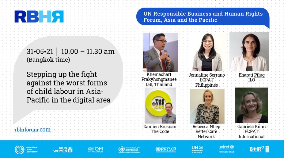 ECPAT International is organising a side-session “Stepping up the fight against the worst forms of child labour in Asia-Pacific in the digital area” leading to the UN Responsible Business and Human Rights Forum, Asia and the Pacific. The UN Forum is organised by the UN Working Group on Business and Human Rights, ILO, UNDP, IOM, UNICEF and other partners.